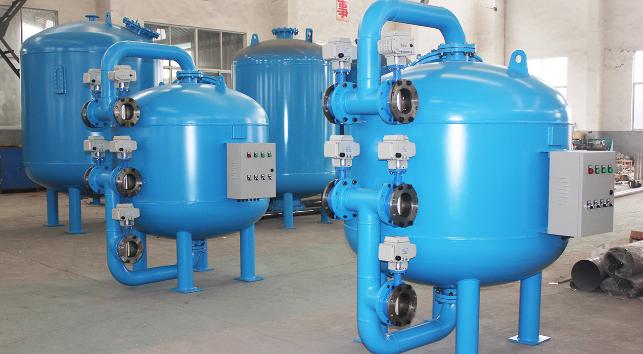 • 高速淺層砂缸過濾器,又(yòu)可(kě)稱作(zuò)循環水旁濾裝(zhuāng)置,采用(yòng)旁濾過濾,并不是将過濾器安(ān)裝(zhuāng)在總循環管路上将所有(yǒu)的循環水過濾一遍,而是在總循環管路上引出一部分(fēn)循環水過濾,它是通過逐步多(duō)次的循環截留,将系統内的雜質(zhì)過濾,最後通過必要的反沖将雜質(zhì)去除出系統。通過在循環水系統上安(ān)裝(zhuāng)高速淺層砂缸過濾器,可(kě)以防止系統中(zhōng)末端管路污泥堵塞,并配合加藥處理(lǐ)有(yǒu)效地去除系統内的雜質(zhì),降低循環水系統的濁度,但确切的說是為(wèi)了減少粘泥,避免其在換熱器中(zhōng)的沉積,更好的發揮藥劑的作(zuò)用(yòng)。